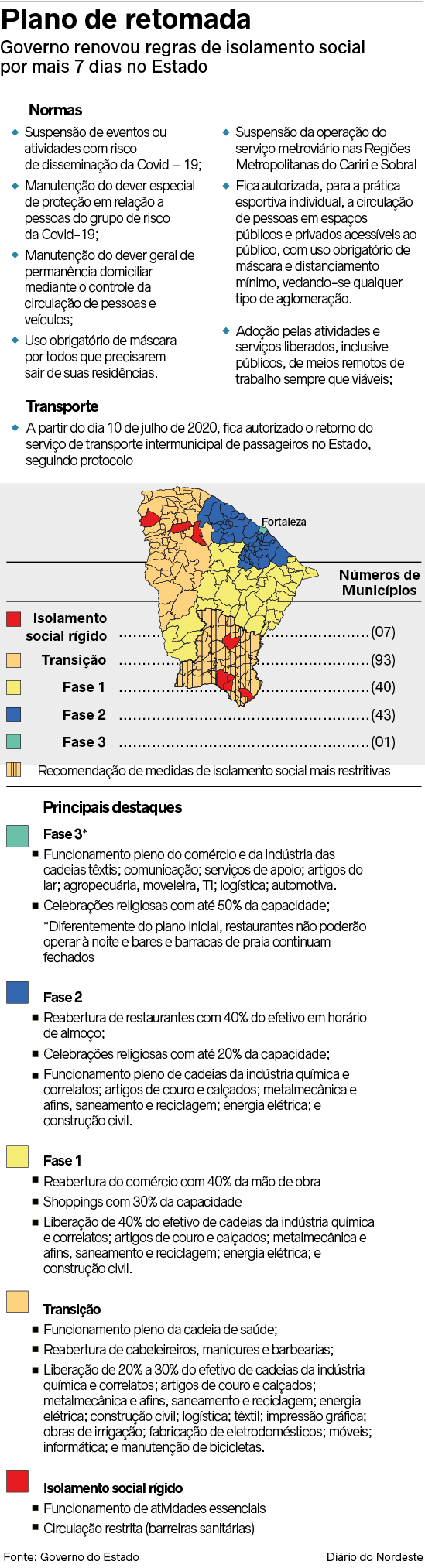 O Governo do Ceará determinou ontem (4) que Fortaleza passa, a partir de segunda-feira (6), para a fase 3 do Plano de Retomada Responsável das Atividades Econômicas. No entanto, o avanço excluiu a reabertura de bares e barracas de praia, além do funcionamento de restaurantes no período noturno, que estavam previstos inicialmente na fase 3.